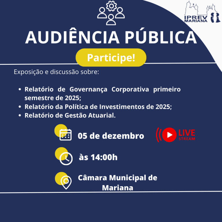 O IPREV Mariana convida a todos para participarem da Audiência Pública que ocorrerá no dia 05 de dezembro (sexta-feira) na...
